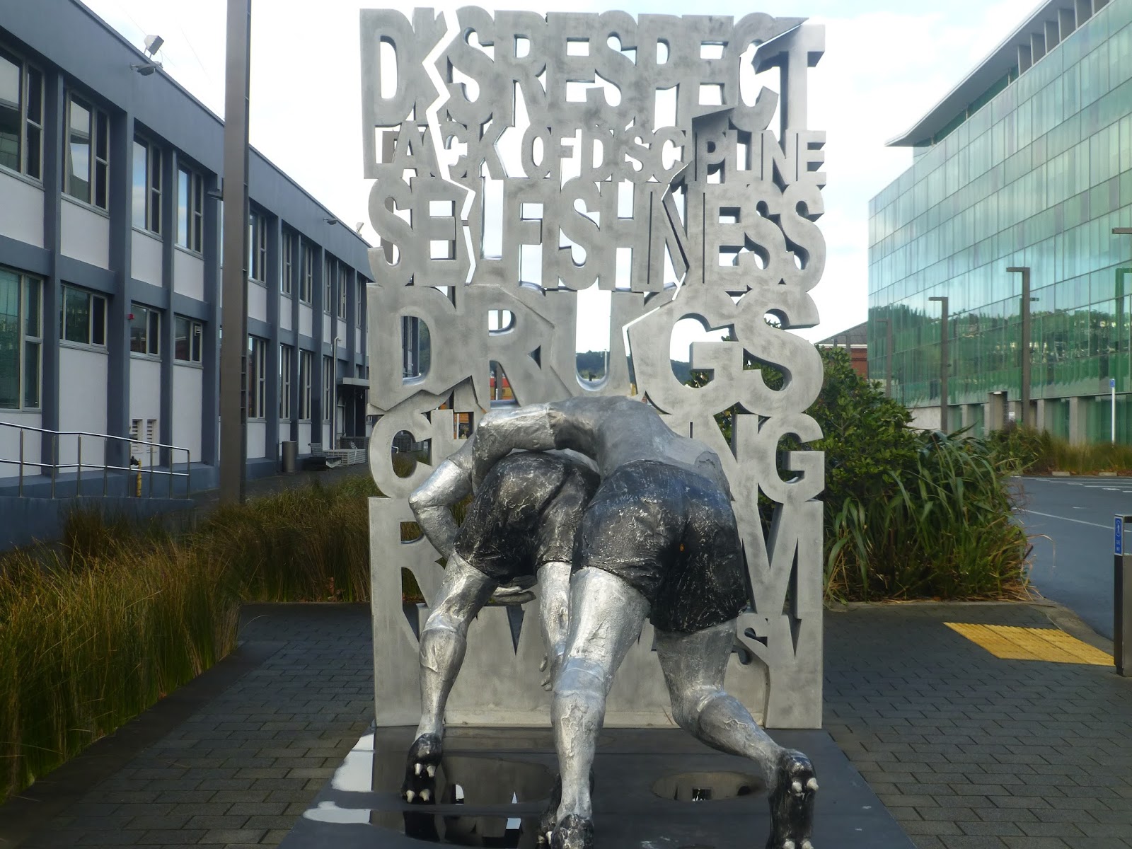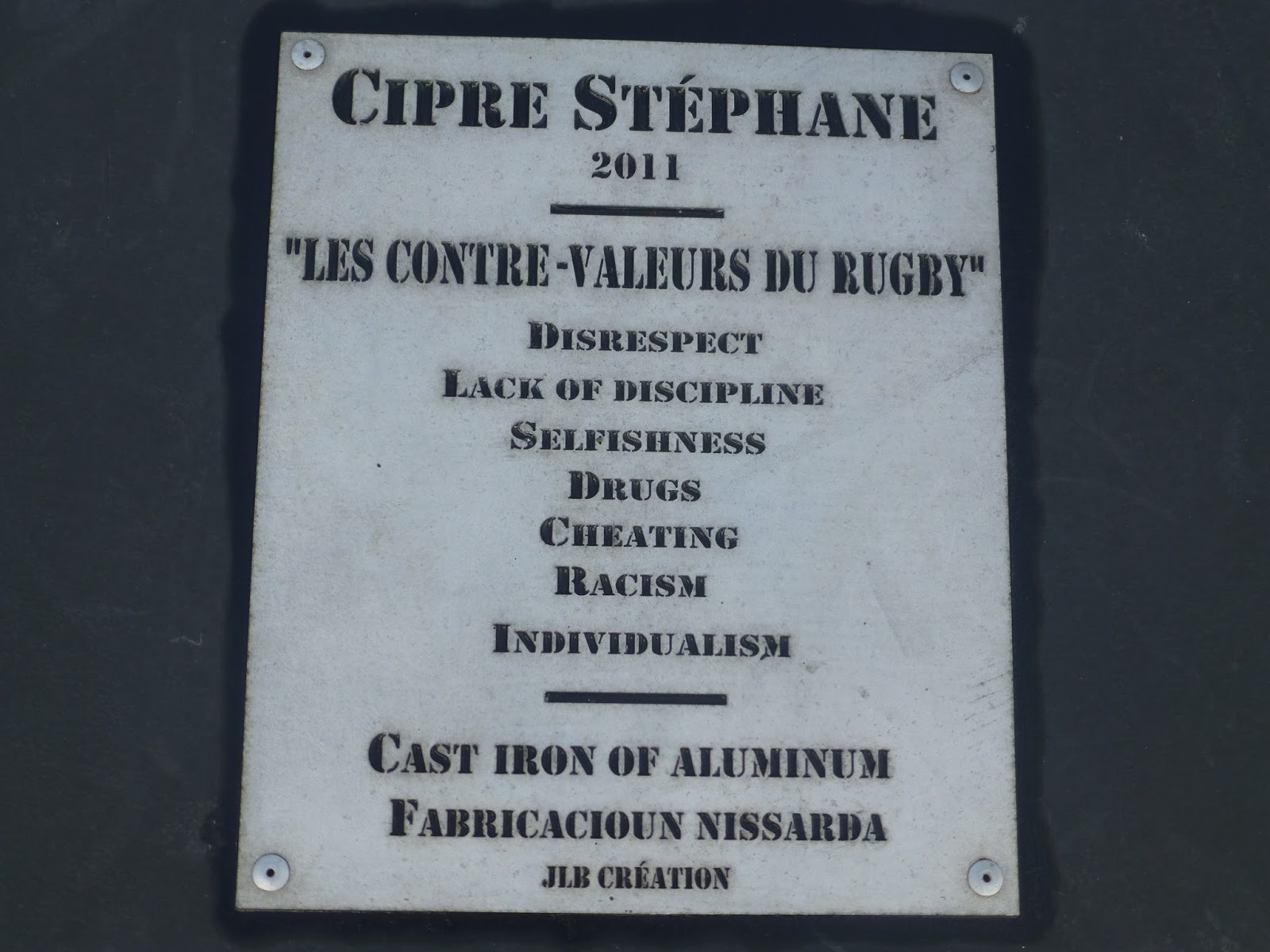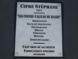Although Strictly part of the Wellington Writers Walk i thought it would be worth adding it. Made for the World Cup Rugby 2011 held in NZ by Cipre Stephane. It is located at the NZ rugby office further along the water front near the Westpac Stadium.