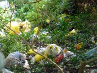 Thrown down among the trees is a large amount of household rubbish,and looking at the amount it has built up over time.